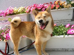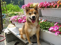 | 庭のお花の前でハイポーズ!! いい天気だけど暑いですぅ〜。 |
