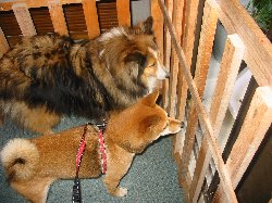 | 胆石手術後のサリー。思ったより元気だったので一安心。 散歩から帰って何か気になる二人。ご飯の時間かな? |
