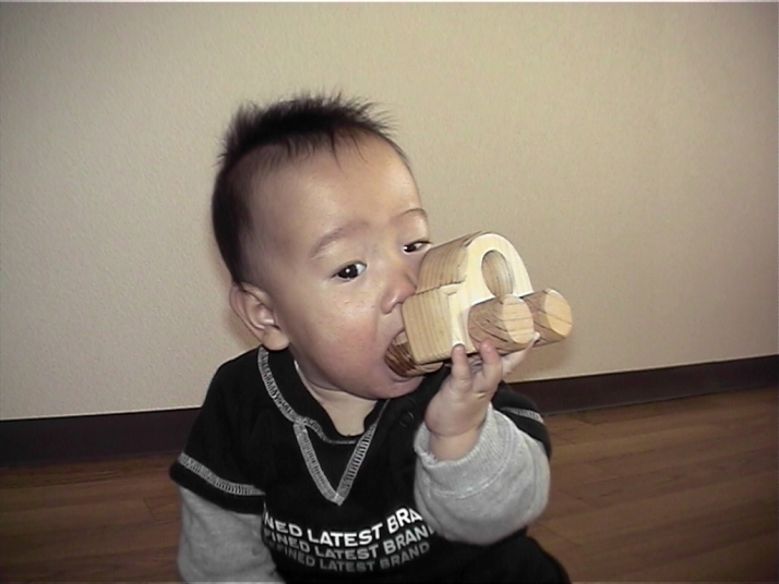 | 12月3日座るようになりました。おもちゃに興味があります。口に入れてみます。木の味が好きみたいです。 |