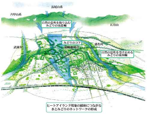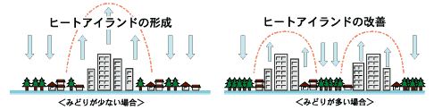 市街地と接して樹木林が存在する場合に、市街地と樹木林との温度差により、樹木林内に部分的に下降気流が生じ、それにより冷却された 重い空気が樹木林から市街地ににじみだし、市街地のヒートアイランドを改善する効果 があります。