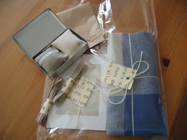 ケース入りピンクッションセット、リネンのテープ2種類、French Countryのブルー系のチェックの布を買う。