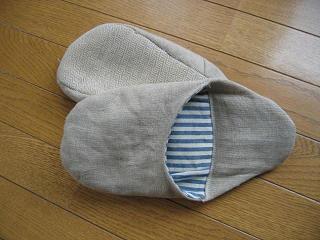 ずっと作りたかったバブーシュ型のスリッパを作りました。 中のストライプが夏らしい感じに!