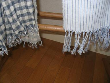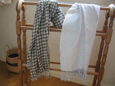 ストールを2種類作ってみました。チェックの方はコットンリネンのダブルガーゼ。フリンジは短くし、洗いをかけたらよい感じに。