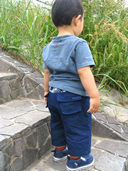 最初はパンツと一緒に縫い込み、「前掛け風」にしようかと思ったのですが、その時々で前掛けをつけたり、はずしたりしたいなと