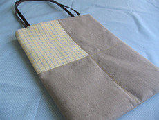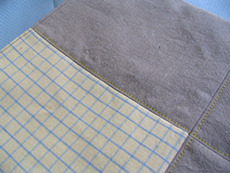 外布の片面のみ4分割して、1面だけ黄色のチェックを使ってみました。またその黄色の面をはさむように黄色の糸でステッチ。