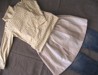 タートルは気に入っててずっと使えずにいた生地で。スカートは全て「麻デニム」と名のついた生地の色違いを使い、つなぎ合わしてみました。