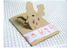 そしてカシオは…。 最初「クリスマスカードにする」と言ったと思ったら、急に「やっぱり地球にありがとうってカードを作る」なんて、どでかいことを言っていたのに、結局はトナカイさん描いてるし。(笑) というわけで、赤鼻のトナカイさんを表紙にして、クマに「ありがとう!」を伝えるカードを作ることにしたようです。 カシオが書いた絵を私がカッターで切り、ペコッと立たせてやりましたが、 なんだろ、この立たせた時の達成感。ふふふ。 でも、このカードは二つ折りだったので、パカッとカードが開いて中が丸見えだったのが気になったようで、ちょっと考えてから「いいこと考えた!絵描いたヒモみたいなの作るわ」と言い出しました。 どうやら、細長く切った紙に絵を描き、それをリボン風にしてカードに巻いて閉じる、ということを思い付いたようなのです。 そして珍しく黙々と作ったのがこれ。リボンにはそれぞれ、プレゼントやトナカイさんやサンタさんの絵が書かれています。 なんてかわいいリボンなんでしょ。素直に素敵だなぁと思いました。 やっぱり子供にはかないませんね。とほほ。 先日のワークショップがキッカケで、はまってしまいそうです、私。 これからもできればちょこちょこカードも作っていきたいな。 ではでは、最後に…。→handmadeつながりで…