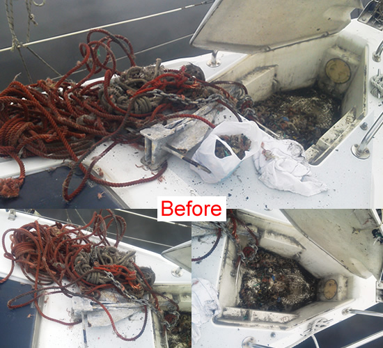 10月18日(木)に、船検定期検査を受けるので、その事前の確認がメインである。 11:40:エンジンの作動確認のため、エンジンを始動。 スイッチオンすると、順調に始動した。そのまま、2,000rpm前後で回しておく。 ・燃料インジケーターは、満タンを示している。OK。 ・冷却水も順調に排水されている。OK。 ・航海灯の確認、マスト灯、両色灯、船尾灯が点灯するかを確認。OK。 その他の法定備品の有無を確認し、キャビン内に揃えたおいた。 13:00:エンジンをストップ。 ストップ直後のバッテリーインジケータは、13.5VDCを指していた。 エンジンストップ後、少し時間を空けて再度指示値を見たが、その指示値は徐々に下がっているようだ。 何とか、検査の日までもってもらいたい。 アンカーを見に行こう。 以前、行ったときはアシナガバチがアンカー収納室内に巣を作っている時だったので、 出入り口となる部分を塞いでおいたが・・・? 思い切って、アンカー収納室を開けた。 案の定、製作途中の小さな蜂の巣があったが、蜂はいない!本件、問題なし。 しかし、汚いなぁ。どろどろだぁ。 検査官殿に見てもらうために、きれいにしておこう。 収納してある雑索・アンカーロープ・アンカーを放り出して、収納室を水洗いした。 また、ロープの痛んでいる箇所をカット・補修した。 結局、この難作業に2時間掛かってしまった。 ちょいと、バテバテとなった。 |