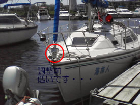 | 帰港に向かいジブファーラーを降ろそうとしたが降りなくなった。 帰港後に、ファーラーシステムの高さが悪いのだと判断して微調整したが、なかなかうまくいかず。 サウスポイント山崎さんに、状態を見ていただいた。 ファーラータックのドラム位置を大調整いただき、もとの状態から10cm以上も上がった。 だいぶ低い状態で、無理に使っていたということのようである。 |