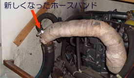 | エンジン排水ホースのホースバンドが切れて排水が船内に漏れているのを