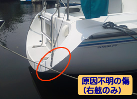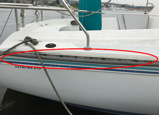 | 平成30年5月27日、右舷船尾側から船体中央付近までの舷側船体付きの防舷材が外れていたので、接着剤と両面テープにて補修しました。 | |||