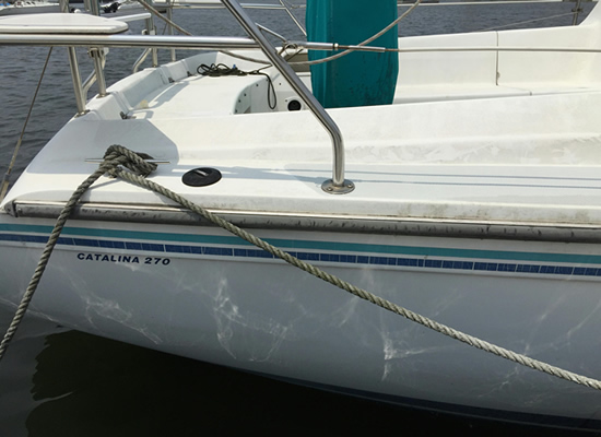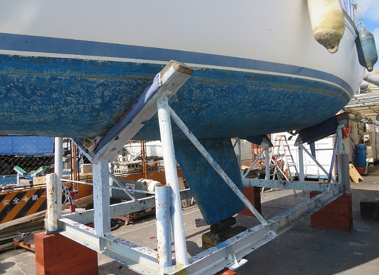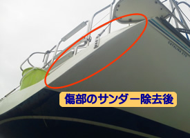 また、何故か不明であるが船尾右舷のコーナーにも傷ができていたので、ついでに上架・修繕してもらうことにした。 上架したところ、プロペラがすでに汚れているとの連絡を受けた。 当方提供のプロペラ塗料が古かったので、その防汚効果がなくなっているようだ! マリーナの提案で、マリーナのペラクリーンを使うことにした。 また、気になっていたプロペラシャフトのジンクの状態も確認でき、問題ないことがわかった。 今年は、取り替える必要はないようだ。 以下が改修点で、写真は6月19日に確認に行った時に撮影した。 @ 左右舷の船名の貼り替えと船体磨き 船名ステッカーは、当方でステッカー屋に製作依頼して、マリーナには貼り替えをお願いした。 その船名書体は、従来よりも太字で丸いものである。 水面上の船体にこびりついていた汚れがきれいに除去され、光沢が出ている。 A 船尾右舷の傷のサンダーによる除去と塗装 左右舷の状態を同じにするために左舷側もサンダー・塗装をしてくれた。 B プロペラの再塗装 写真は前の塗装を除去した後の今回の塗装の前の状態である。 プロペラシャフトのジンクが良好であることがわかる。 桟橋の不具合から生じた事故対応扱いということで、当方のマリーナが上記の補修作業を無償で実施してくれた。 感謝します。 |