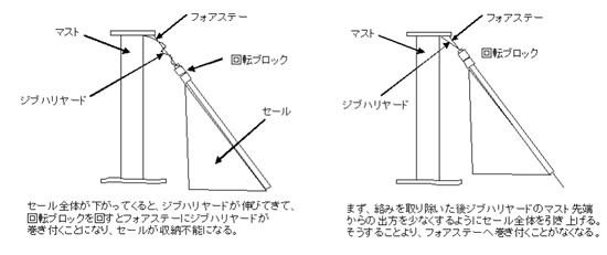 | ジブファーラーがうまく収納できなくなったので、その調整を行った。 (作業者) 黒井さん、鍋田さん、三宅 (問題点) 昨年11月3日に同様の状態になったが、それから半年でだんだんとジブハリヤードのロックが 緩んできたのであろうかセール全体が下がってきたようである。 セールヘッドに取り付けてあるファーラーの回転ブロックとジブハリヤードをシャックルでつないでいる。 セールが下がると、マスト先端からファーラーブロックまでの距離が長くなる。 ということは、ジブハリヤードがマスト先端から長く伸びてくることになる。 ジブハリヤードが長く伸びると、セールを収納しようとしてセールを回すと ハリヤードの伸びた部分がフォアステーにくるくると巻き付いてしまう。 そうして、最後には回らなくなってしまう。 |