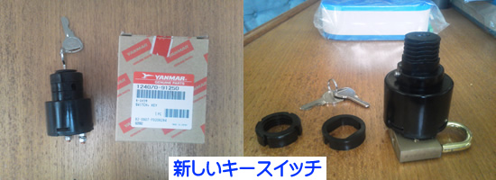 ヤンマー殿にその連絡先を聞き、帰宅後に手配をお願いした。 平成24年10月30日に、キムラマリーンに手配をお願いしたキースイッチが入荷したので受け取りに行き、 その足で取り替えに行った。 |