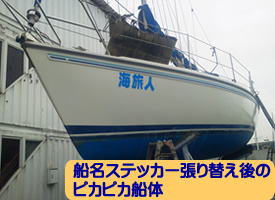 | 下の写真は貼りつけ直後のものですが、この船名貼り替えの経緯・顛末は、「平成24年6月19日メンテあれこれ」に書いています。 | |||