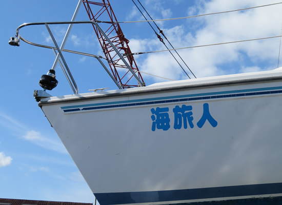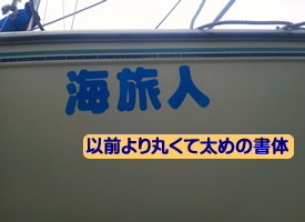 | パソコン内を整理していて、船名の「海旅人」ステッカー製作依頼の文書が見つかったので残しておく。 下記の船名は、ヨット(カタリナ27)を購入したときに黒井さんがエクセルで作ってくれた原本です。当時はシールを買ってきてまして、黒井さんが切り抜き船首に貼り付けてくれたと記憶しています。 |