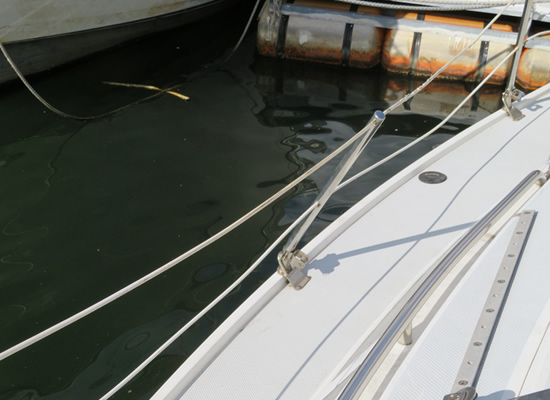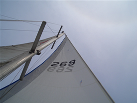| ジブセールを取り付けました。手順は、 @ファーラーのヘッドのシャックルを取り付ける。 Aジブハリヤード引っ張ってセールを上げる。 Bタックのシャックルをつける。 Cハリヤードをしっかりと引っ張った後にハリヤードをロックする。 Dセールを巻き取る。 ここで、うまく巻き取ることが出来ないことが判明。 どうやら、以前のセールでは問題にならなかったヘッドのスナップシャックルが 回転を邪魔していることに気がつき、はずすことに決定。 一旦セールをおろしてスナップシャックル外しに取りかかる。 その時に、シャックルを止めるシャックルスタッド(左上写真参照)が 落下して水中の藻くずと消えました。 臨時でシャックルを止めて、うまく巻き取ることを確認。やっぱり、うまくいく! 落とした部品は、代用品を買うか作るかしよう。 以前のよりもセール面積が小さくなったようなので、以前のセールは150%ジェノアだったのだと、 今更ながら感心した。 |