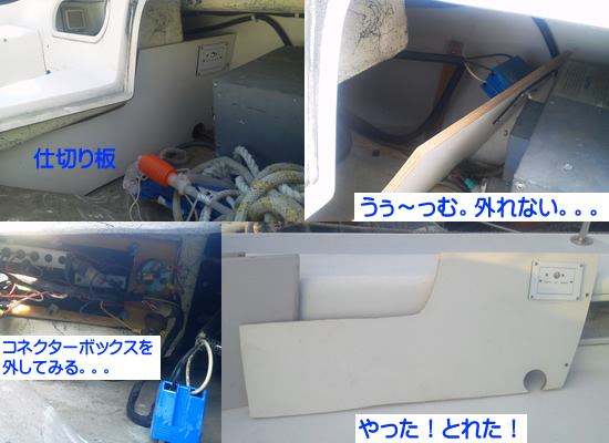 取り換え作業開始:12:15 @ 仕切り板の取り外し エンジン操作盤の配線部と収納ボックスを仕切っている化粧板を取り外した。 その仕切り板にはブレーカにつながるコネクターボックスが配線されている。 最初は、コネクターボックスを外す手間を避けて、つけたままでうまく仕切り板が外せればめでたしと思い、 コネクターボックスをつけたまま仕切り板を止めている2箇所の木ねじを外した。 あっちこっちが邪魔して、仕切り板が抜けずに、エンジン操作盤の裏側へのアクセスができない。 仕方なく、コネクターボックスを止めている4か所のねじを外し、ボックスを仕切り板から外してみた。 仕切り板は、収納ボックスから、無事に撤去できた! |