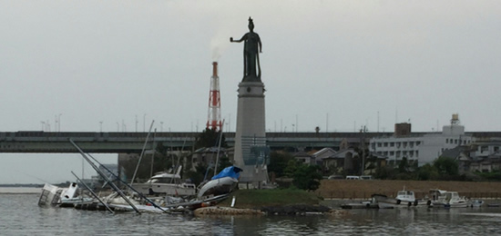 | 台風21号により、マリーナ桟橋が漂流し、女神像のある対岸に座礁しました。 | |||