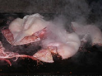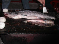 ライダーハウス白樺名物チャンチャン焼きです。 上が鱈で下がホッケ!右は知床のドスイカです。 豪快に焼く。うまい! トドや熊の肉もあります。 |