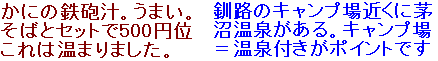 屈斜路キャンプ場に到着したのは暗くなってから。 寒い!ここは仁伏温泉があり、横にテントを張った 静岡のRF400君と一緒に風呂に行きました。 ビールを飲み色々話したRF君!見たらメール下さい! |
