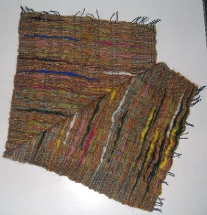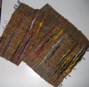 | 写真ではわかりにくいのですが、 たて糸を極端にへらして、横糸に原毛(ウールの綿毛のまま)をいれてみました。 織りたてホヤホヤのときは、原毛が頼りないのですが、 これを洗濯すると、フェルトのように絡んでいい具合に☆ タイトルは、今年の干支にちなんでみました♪ さをりの教室にでこんな風合いのベストを着ている人を見て 「ぜひ作ってみたい!!」と思っていたのを実現しました。 さて、どんな風に仕立てようかしら? |