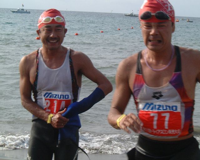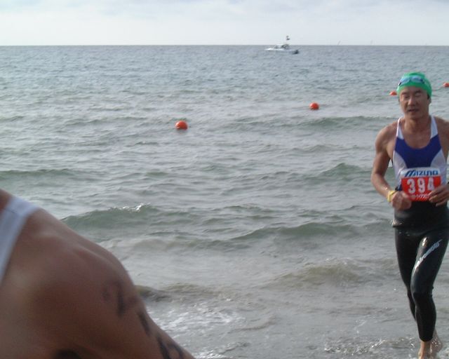 掛樋君に遅れることしばらく、やっと私がスイムアップです。もう疲れ切っています。が、恐怖のスイムが