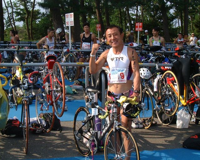 さて、これは誰の写真でしょうか。左の人の後ろ側のボトル(赤い模様のボトル)は徳之島トライアスロンの第十回