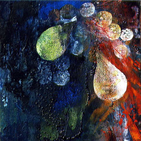 パネルに脱脂綿、アクリル絵の具、固形水彩、胡粉、墨汁