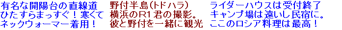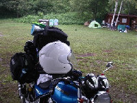 サロベツ原野とオロロンライン。サロベツでは観光 バスの客から4回話しかけられる。皆同じ事を聞く。 どこでも観光バスと会うと一人は話しかけてくる。 過積載バイクと神戸ナンバーが目立つらしい。 オロロンは眠くなるほど長い直線!留萌でOIL交換 | 2度目のR・Hち炉りん村。ここで昨日の夜一緒に騒いだ大阪のCB君と再会。この日もドンチャン騒ぎになる。凄く楽しい。このメンバーは女の子も含めてすべて一人旅ですよ。色々な方言で会話するので愉快です。夜の2時位に撮影。もちろん寝不足 | ||||||||||||||||||||||||||||||||||||||||||||||||||||||||||||||||||||||||||||||||||||||||||||||||||||||||||||||