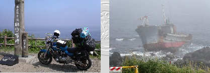 納沙布岬に到着。この日は8/19(バイクの日)で 安全運転の黄色い根室オリジナルフラッグを貰う。 灯台前にロシア船が打ち上げられていた。不気味 |